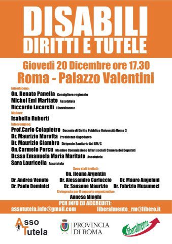 Si svolgerà a Roma il 20 dicembre alle ore 17, 30 presso il Palazzo Valentini il convegno “Disabilità diritti e tutele”. Le associazioni Assotutela e Liberalmente promuovono tale iniziativa in un ottica di divulgazione ed approfondimento delle tematiche e problematiche legate alla disabilità ed alle gravi difficoltà che tale categoria di cittadini incontra nell’affermazione dei propri diritti e tutele. Saranno presenti relatori illustri quali il Consigliere Provinciale On. Renato Panella che parlerà della tutela dei disabili nella regione Lazio, il Prof. Carlo Colapietro che affronterà l’importante tematica di come la nostra Costituzione tuteli i diritti dei disabili, il dott. Maurizio Giambra che ci illustrerà i criteri del riconoscimento delle disabilità, l’On. Carmelo Porcu che metterà al corrente i partecipanti dello stato dell’arte delle attuali leggi sulla disabilità e il dott. Maurizio Marotta che trasferirà l’esperienza dell’inserimento al lavoro della Cooperativa sociale Capodarco.