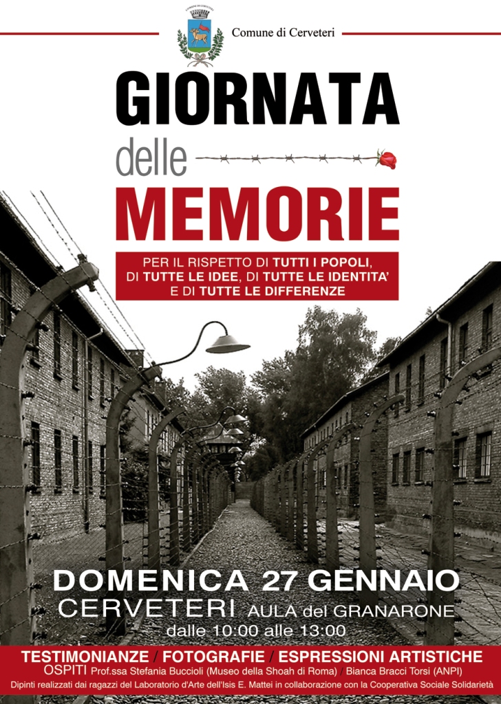 “Durante la Giornata – ha illustrato il Sindaco – ascolteremo le testimonianze della Prof.ssa Stefania Buccioli del Museo della Shoah di Roma e di Bianca Bracci Torsi dell’ANPI. Siamo onorati di ospitare a Cerveteri due donne che da tutta la vita combattono strenuamente contro la violenza e l’oppressione. Ogni finestra del Granarone sarà allestita con una mostra fotografica e sarà proiettato un estratto del film “Le bambine dai capelli bianchi. La storia di Andra e Tatiana Bucci” prodotto dal Liceo Aristofane di Roma. Avremo poi altri preziosi contributi come quello di Grazia La Manna, di Miro Landoni e del consigliere comunale Stefano Bibbolino. Ognuno di loro ha voluto mettere del proprio ed offrire un diverso spunto per far conoscere ed approfondire, attraverso le emozioni e la storia, quello che ancora oggi, a più di 60 anni dall’atrocità della Shoah, rappresenta ancora un tabù. Ovviamente, sarà un’occasione per ricordare tutti gli altri stermini e i genocidi che, purtroppo, caratterizzano la nostra storia contemporanea e che non dovranno esserci mai più”.