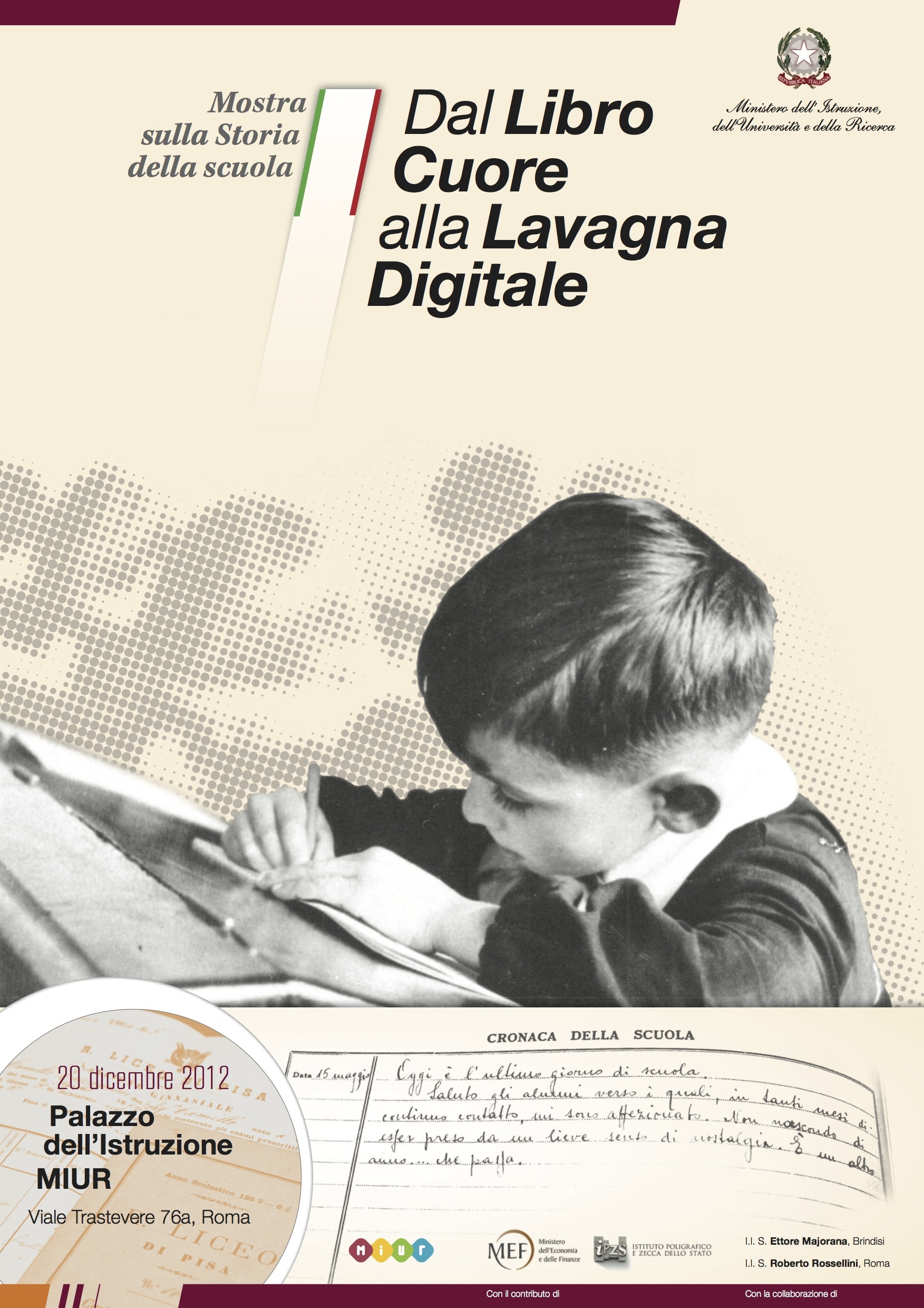 Per una volta le porte del palazzo non lasciano trapelare voci di funzionari che parlano  di concorsi, posti, progetti, tagli….ma raccontano la storia della scuola pubblica italiana dall’Unità d’Italia ai progetti futuri di una scuola completamente informatizzata. Si comincia con due aule contrapposte: la prima ospita i banchi di legno scuro, la lavagna basculante, il pallottoliere, i quaderni neri, pennini e calamai, la bacchetta del maestro….di fronte, tavoli tondi di materiale plastico candido su cui i piccoli che frequenteranno la scuola poggeranno i loro tablet seguendo le lezioni non più dalla cattedra, che ha lasciato il posto ad una consolle da cui l’insegnante darà i comandi ad un pc. La parte più interessante della mostra sono tuttavia i documenti che ci raccontano l’evoluzione della cultura della scuola in Italia: libri di testo, quaderni, giornali, tra cui spiccano intere pagine del “Corriere dei Piccoli”, fotografie di intere classi che attraversano i decenni, registri di classe, elenchi di alunni, documentazione di concorsi di professori, presidi, ispettori. La Storia con la s maiuscola si interseca con la storia della scuola: la guerra, le colonie, il fascismo, il dopoguerra, la ricostruzione, gli anni settanta…..i mutamenti sono documentati con precisione, anche se la visita avrebbe bisogno di più tempo, tante sono le carte, le fotografie e i documenti in mostra….dai diplomi alle certificazioni, dai suggerimenti per gli insegnanti (Il catechismo del maestro!) alle pagelle, dagli esercizi calligrafici ai sussidiari….. Nella sala della Biblioteca sono conservati due esemplari di “Cuore” di De Amicis : il primo è un volume in prima edizione numerata, l’altro in caratteri Braille: i ciechi erano davvero numerosi dopo la Prima guerra mondiale! Visite guidate si possono richiedere al Ministero per classi e semplici cittadini.
