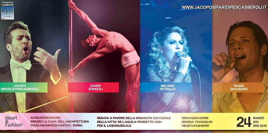 Lunedì 24 marzo dalle ore 20.00 l’Acquario Romano, presso la Casa dell’Architettura, sarà il prestigioso palcoscenico di un incontro artistico a tutto tondo facente parte del progetto “Heart and Fashion” organizzato da Simona Travaglini. L’amore è il “file rouge” che avvolgerà la serata in quattro delle sue sfumature: Amore e Passione, Amore e Tradimento, Amore e Solitudine ed Amore e Morte. I sensi saranno avvolti in uno spettacolo multisensoriale in cui si partirà dalla mirabile musica del Maestra Jacopo Sipari di Pescasseroli con l’Orchestra Sinfonica Marco dall’Aquila, per continuare con la sfilata di alta moda del grande stilista Ivan Donev , di Camillo Bona, di Gianni Molaro e la Maison Sarli. I quadri coreografici saranno accompagnati anche dalle voci di Melania Petrillo e Biagio Graziano e dalla danza acrobatica del pole dancer Davide Zongoli. Eleganza, gusto ed emozioni si intrecceranno per un evento unico che ha anche finalità benefiche. Parte del ricavato sarà infatti devoluto al sostegno del progetto +ADD “Un computer per L’Aquila” promosso da Bioterra Onlus, Rotary Club Roma Nord, Rotaract Roma Nord e John Clutech srl.