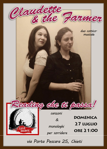 Domenica 27 luglio alle ore 21.00 nella splendida cornice di Porta Pescara presso la vineria Cueva Brigante a Chieti, Claudette & The Farmer, ovvero Roberta D’Orazio (voce narrante e cantante) e Valentina Verzella (chitarra e ukulele), dopo un periodo di silenzio trascorso a lavorare nella propria azienda agricola, torneranno sulle scene con una versione rivista e rivisitata del loro spettacolo comico-musicale “Reading che ti passa”.