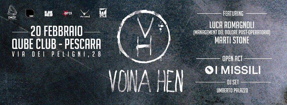 I Voina Hen non si assumono nessuna responsabilità sui danni a cose, oggetti o persone che potranno verificarsi durante lo svolgersi del concerto di venerdì 20 Febbraio presso il Qube Club a Pescara. Tutte le parti del corpo, i denti e gli zigomi che dovessero essere ritrovati dopo il concerto saranno raccolti e lasciati all’ingresso del Club. Consigliamo caldamente ai giovani avventori di munirsi di caschi e paradenti per salvaguardare la propria incolumità fisica e mentale. Sconsigliato anche, fare sfoggio di una conoscenza approfondita degli eventi avvenuti nell’ultima edizione del festival di Sanremo per non incorrere in accese rappresaglie durante il pogo. Vi ringraziamo anticipatamente, augurandovi una splendida serata. I Voina Hen“.