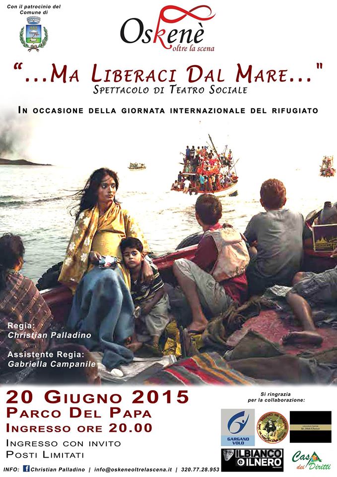 San Giovanni Rotondo, 28 Giugno 2015: in occasione della Giornata mondiale del rifugiato, questa è la data in cui il giovane regista sangiovannese, Christian Palladino, presenterà al pubblico locale la mise en scène di “…Ma liberaci dal mare…”, spettacolo di teatro sociale, avente come argomento cardine una tematica tanto spinosa – per l’assenza di opportune reti d’accoglienza – quanto reale: l’immigrazione in Italia nell’era post-moderna.