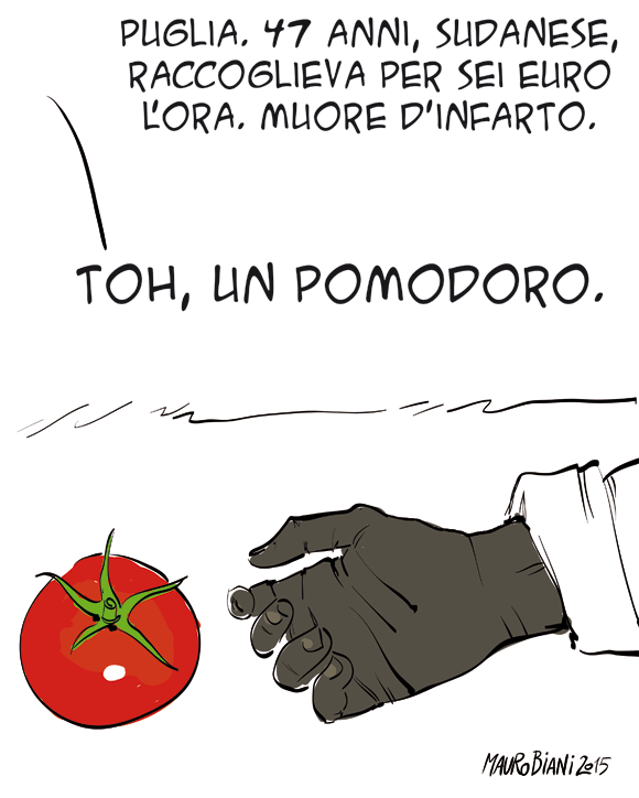 Ma è bene che Mohamed, il bracciante che oggi è morto d’infarto mentre raccoglieva pomodori per pochi euro l’ora, non diventi un altro punto strumentale alla politica di alcuni, composta da slogan e non interessata per tanti motivi al vero problema. Il vero problema, difatti, non è la nazionalità di quest’uomo, in Italia regolarmente, con documentazione e permessi di soggiorno validi, ma il lavoro (in nero) che non è solo una sua prerogativa ma anche di tanti italiani.