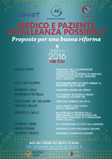 Giovedì 11 Febbraio alle ore 17.30, presso l’Ordine dei Medici di Roma (Via Giovanni Battista De Rossi, 9), si terrà il convegno “Medico e paziente, un’alleanza possibile? Proposte per una buona riforma” organizzato dall’Associazione culturale Alternativa Europea in collaborazione con Sanit (Forum Internazionale della Salute) e C3 International con il patrocinio della Regione Lazio e del Forum Nazionale Giovani. Scopo dell’incontro è approfondire il Disegno di Legge Gelli sulla “Responsabilità professionale degli operatori sanitari”, approvato dalla Camera e attualmente all’esame del Senato. Obiettivo dell’attesissimo testo di legge, è garantire la sicurezza delle cure come parte costitutiva del diritto alla salute attraverso maggiori garanzie e tutele per i professionisti in campo sanitario da un lato, e maggiore certezza e celerità nei risarcimenti dei danni subiti dai pazienti dall’altro. L’attuale quadro normativo spinge gli operatori sanitari a prescrivere accertamenti nella sola prospettiva di evitare il “rischio-giudice” oppure comporta la fuga da settori professionali come chirurgia e ginecologia. Il danno che segue a tale fenomeno, ormai noto come medicina difensiva, è molteplice: per l’operatore sanitario che non può svolgere le sue funzioni secondo scienza e coscienza; per il paziente, esposto ad accertamenti di per sé invasivi anche se evitabili; per il contribuente, perché la medicina difensiva pesa sulla collettività. La tutela della salute va intesa in senso generale come tutela non solo del singolo paziente ma dell’insieme degli utenti, tenendo conto della limitatezza delle risorse disponibili. Queste esigenze sono state per anni trascurate dal legislatore, che non è riuscito a intervenire con decisione sulla materia, abdicando tale funzione alla giurisprudenza con tutti i limiti del caso. In assenza di un chiaro quadro normativo, al quale con questa riforma s’intende provvedere, considerando il “rischio-giudice”, la tutela del singolo paziente, più debole dell’operatore sanitario o della struttura in una singola controversia, rischia di pregiudicare le esigenze più generali di tutela della salute. Questa riforma si propone dunque di concorrere a bilanciare tali squilibri tenendo saldamente in sé l’esigenza della tutela della salute con quella del diritto alla cura parallelamente a quella della libertà di coscienza di medici e professionisti. Dopo i saluti di Vito de Filippo, Sottosegretario di Stato del Ministero della Salute, dell’On. Michele Baldi, Capogruppo Lista Civica Nicola Zingaretti, e di Maria Pisani, Presidente Forum Nazionale Giovani, a discutere del tema, moderati da Olimpia Troili, Presidente di Alternativa Europea, interverranno: l’On. Federico Gelli, Relatore della Riforma sulla responsabilità professionale del personale sanitario in Commissione Affari Sociali, il Prof. Guido Alpa, Presidente della Commissione consultiva per le problematiche in materia di medicina difensiva istituita dal Ministero della giustizia, Roberto Lala, Presidente Ordine dei Medici Chirurghi e Odontoiatri di Roma e Provincia, Cosimo Ferri, Sottosegretario di Stato alla giustizia, l’Avv. Domenico Pittella, Dottorando di ricerca in diritto civile presso L’Università Roma Tre.