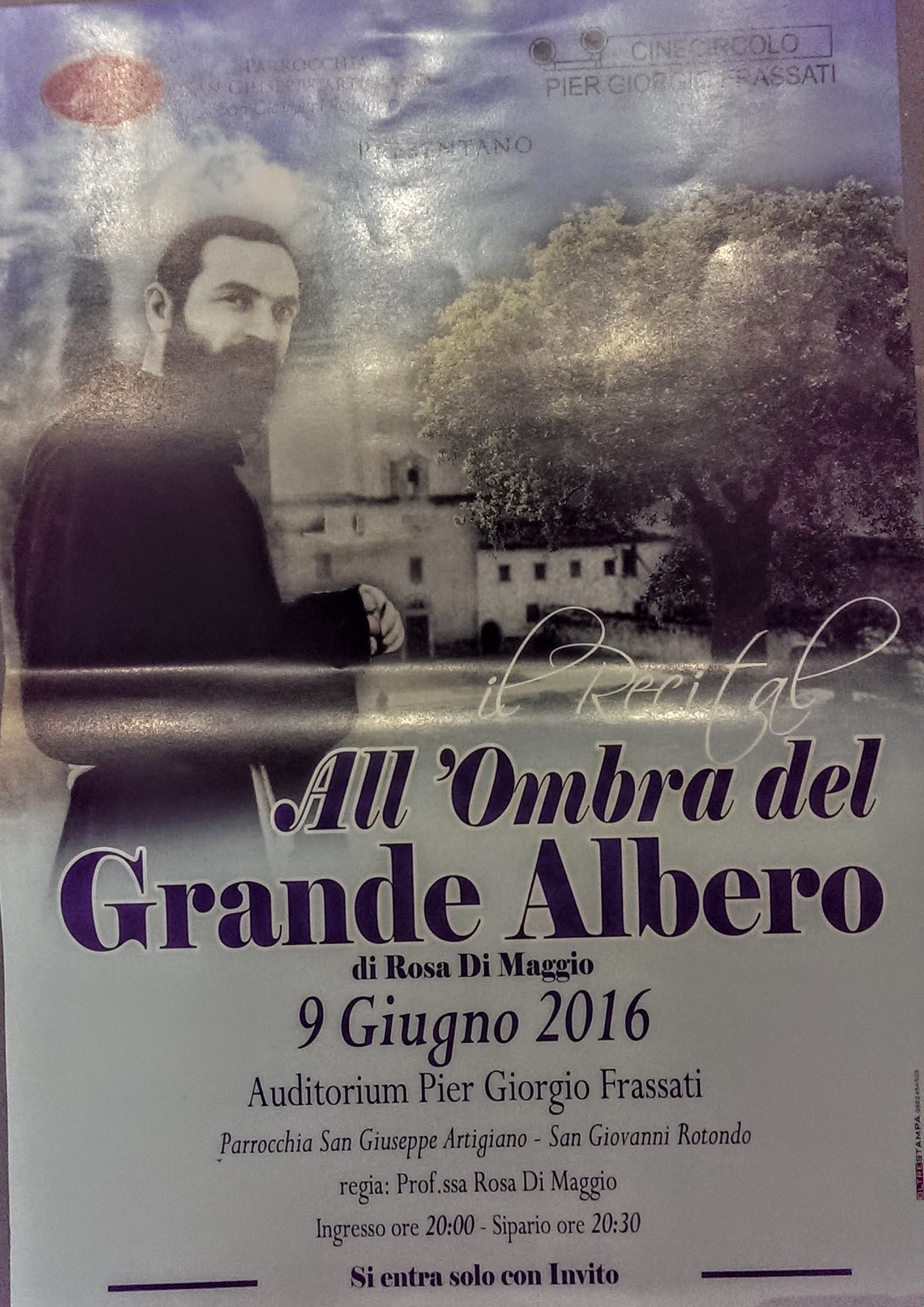 San Giovanni Rotondo, 09/06/2016 – Auditorium “Piergiorgio Frassati”: Si terrà nella suddetta data e nell’istesso luogo il Recital “All’ombra di un grande albero”, abilmente ideato, scritto e diretto dalla poliedrica penna della professoressa e direttrice del Cinecircolo Frassati, Rosa Di Maggio.