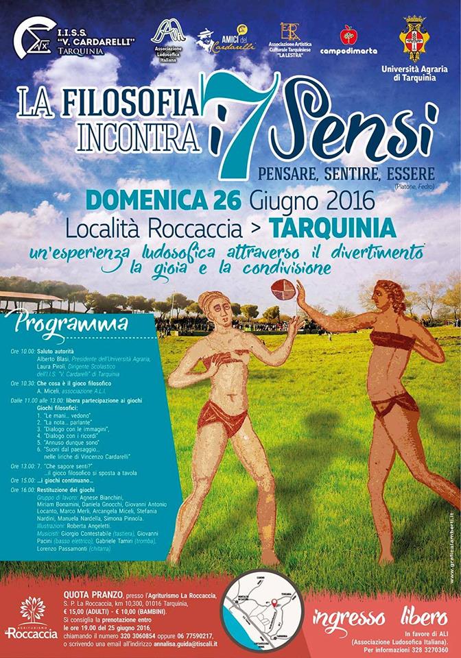 La Filosofia incontra i 7 sensi. E lo farà il 26 giugno in un luogo bellissimo ma allo stesso tempo inconsueto, perché teatro da sempre della Festa della Merca e di altri eventi legati al mondo della Maremma: la Roccaccia. Questa domenica sarà invece possibile vivere un’esperienza ludofisica che unirà divertimento, gioia e condivisione. La manifestazione vede insieme l’Università Agraria di Tarquinia, l’IIS “Vincenzo Cardarelli”, l’Associazione Ludofisica Italiana, gli Amici del Cardarelli, l’Associazione La Lestra e l’agriturismo Campo di Marta. Denso il programma della giornata che si aprirà alle ore 10 con il saluto del presidente dell’Università Agraria Alberto Blasi e del dirigente scolastico dell’IIS “Vincenzo Cardarelli” Laura Piroli. A seguire “che cosa è il gioco filosofico”. Dalle ore 11 alle ore 13 spazio ai giochi filosofici: da “le mani… vedono” a “la nota… parlante”; dal “dialogo con le immagini” al “dialogo con i ricordi”; dall’“annuso dunque sono” ai “suoni del paesaggio… nelle liriche di Vincenzo Cardarelli”. Dopo una meritata pausa pranzo si riprende alle ore 15 con “i giochi continuano”, mentre alle ore 16 avverrà la “restituzione dei giochi”, tra il mondo dell’illustrazione e quello della musica.