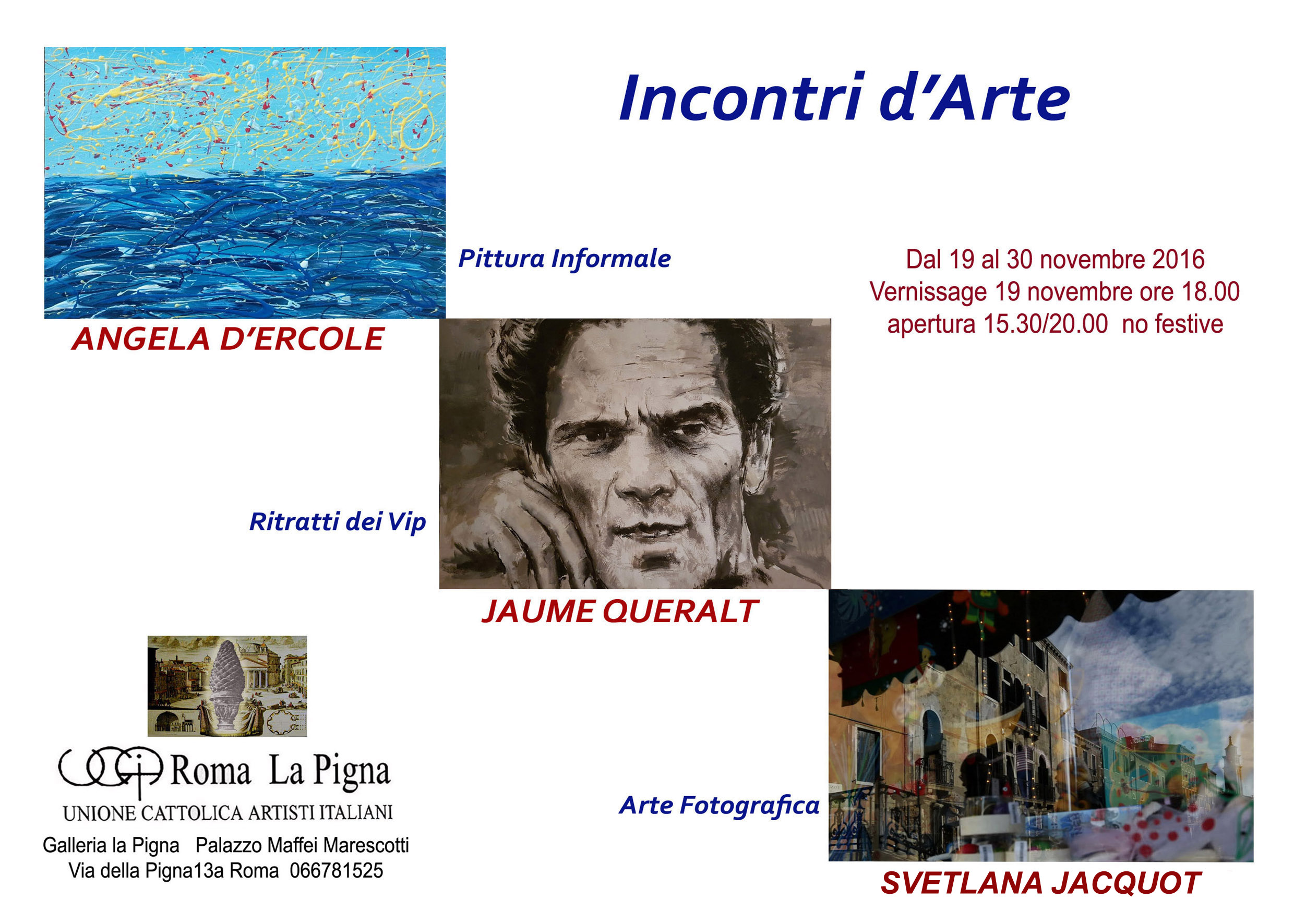 Il 19 novembre 2016 alle ore 18 presso la Galleria la Pigna in via la Pigna 13/a Roma sede del Vicariato di Roma, Jaume Queralt esporrà la sua mostra Ritratti dei Divi degli anni 50, da MASTROIANNI a JAMES FRANCO, GRACE KELLY, TOTO’, PAPA GIOVANNI, FRANK SINATRA, PASOLINI, CHARLIE CHAPLIN, JAMES DEAN, NELSON MANDELA, MORGAN FREEMAN, MARILYN MONROE e tanti altri vip del cinema italiano e mondiale saranno presentati al pubblico presso la galleria sede del Vaticano. Presenta la serata Emanuela Del Zompo, giornalista, scrittrice ed attrice. Ospiti attesa all’evento Max Croci (regista di Poli Opposti), Luca Argentero, il Principe Guglielmo Giovannelli, Christian De Sica e tanti altri.