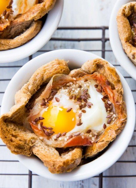 Utilizzate una ciotola rotonda per ogni cestino da preparare. Rivestite ogni ciotola con 2 fette di pancarrè. A questo punto disponete al loro interno la pancetta,il formaggio ed un uovo. Fate cuocere in forno a 180° per circa 20 minuti,rifinite con i semi e servite i cestini così ottenuti ancora caldi.