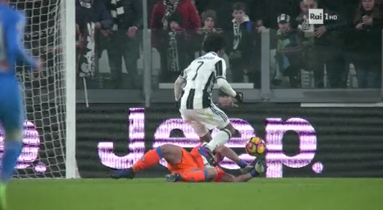 I rigori contestati dal Napoli. In apertura di ripresa, netto quanto inutile pestone di Koulibaly in area su Dybala. Calcio di rigore che lo stesso argentino trasforma. Poi come detto Higuain raddoppia su un altro svarione della difesa partenopea. Al 66′ succede di tutto e la memoria corre alla stagione 1997-98 e al famoso Juventus-Inter con arbitro Ceccarini: rigore negato ai nerazzurri per un fallo di Iuliano su Ronaldo e sul capovolgimento di fronte, penalty per i bianconeri. Un classico per la Vecchia Signora, un classico che stasera si è ripetuto. Per quanto il fallo di Pjanic su Albiol non è da rigore come lo era quello non concesso a “Ronie il Fenomeno” 20 anni fa. C’è invece il secondo penalty fischiato in favore di Madama: Reina sfiora soltanto il pallone ma poi travolge Cuadrado impedendo al colombiano di arrivare nuovamente sulla sfera (foto). Da segnalare nel primo tempo un rigore non dato alla Juve per una spinta allo stesso Dybala. Quindi, da parte dei napoletani: tanto rumore per nulla. Di seguito, il cinema andato in scena allo Stadium: scenette Cinepanettone by ADL.