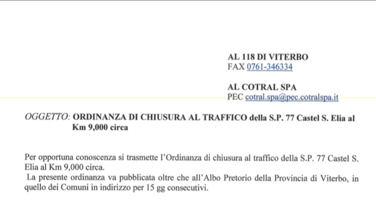 In queste ore l’amministrazione provinciale di Viterbo ha trasmesso una apposita ordinanza di chiusura al traffico della Strada provinciale 77 Castel S.Elia al km 9,000 circa per frana (in foto l’ordinanza)