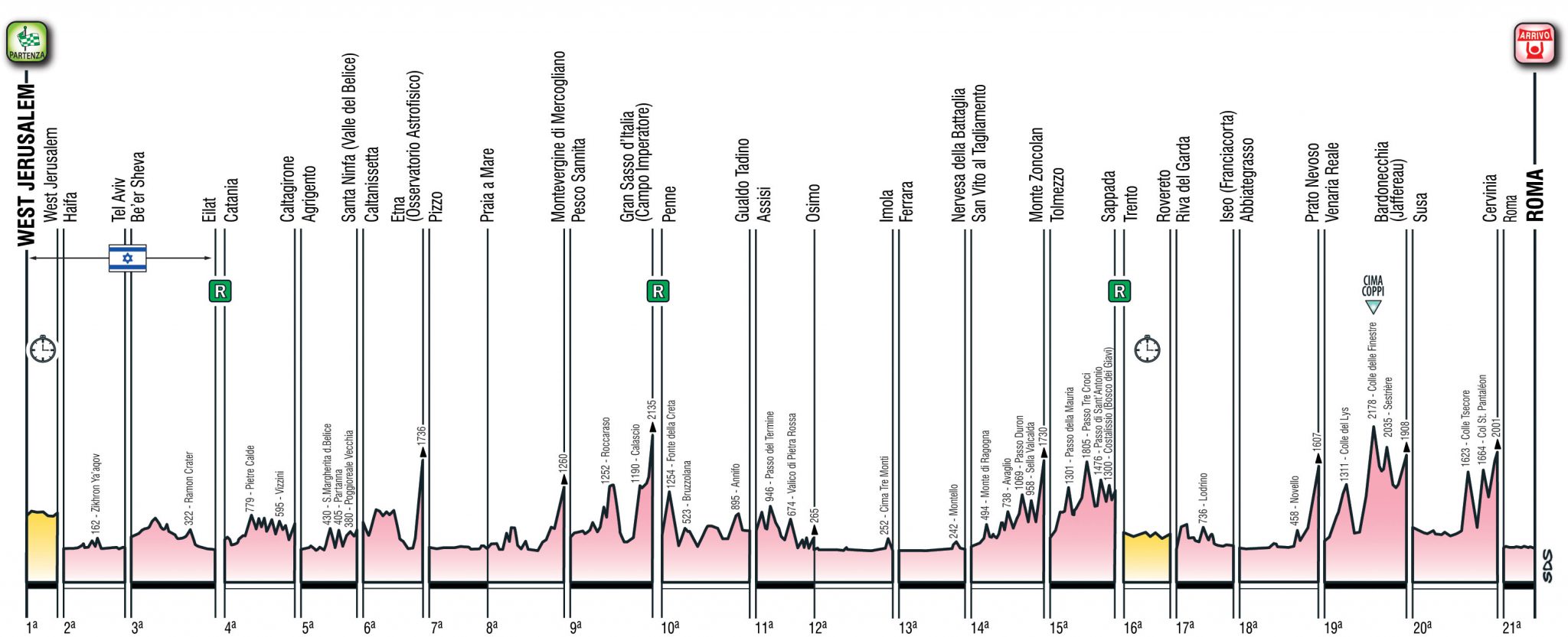 Per la prima volta nella sua storia la “Corsa Rosa” prenderà il via fuori dall’Europa. Si inizierà a pedalare il 4 maggio 2018: la prima tappa sarà dedicata a Gino Bartali, nel ricordo del campione onorato come “Giusto tra le Nazioni” per il suo impegno in favore degli ebrei durante le persecuzioni naziste. Tornati in Italia i ciclisti si rimetteranno in corsa dalla Sicilia: tre tappe in programma e il primo arrivo in salita sull’Etna. Risalendo lo stivale weekend impegnativo tra Campania e Abruzzo, con gli arrivi a Montevergine di Mercogliano e sul Gran Sasso (Montagna Pantani). La tappa da Assisi a Osimo (tappa dei Muri) vedrà il passaggio sul Muro di Filottrano, un omaggio alla memoria di Michele Scarponi, scomparso di recente dopo un terribile incidente in allenamento. Per i 100 anni dalla fine della Prima Guerra Mondiale l’arrivo a Nervesa della Battaglia, con successiva partenza da San Vito al Tagliamento per il traguardo più temuto, sul terribile Zoncolan.