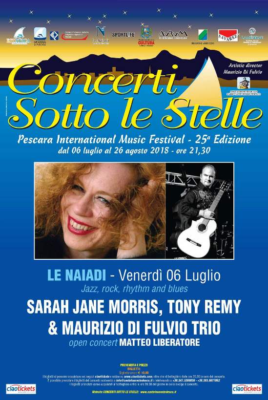 Venerdì 6 luglio Sarah Jane Morris, Tony Remy & Maurizio Di Fulvio trio in concerto a Le Naiadi a Pescara.