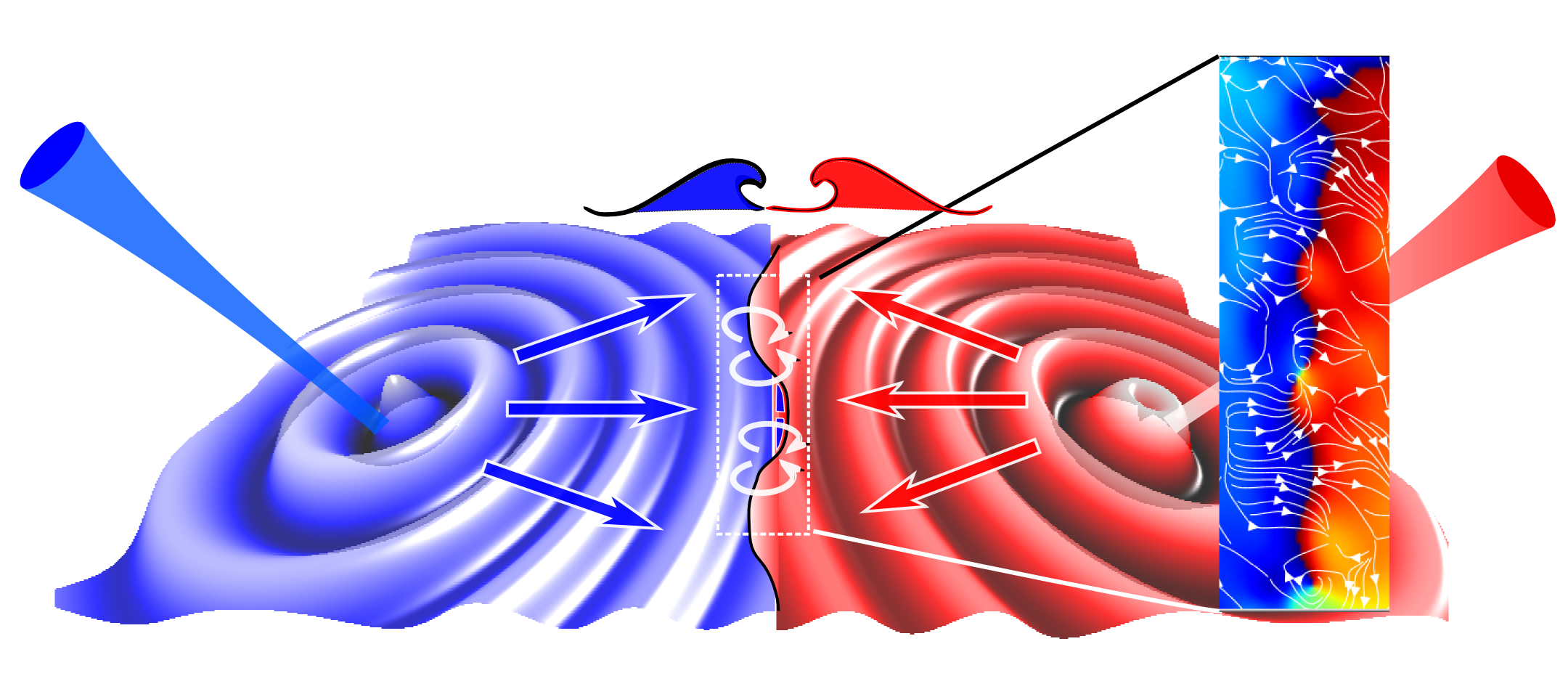 * Figura allegata: Giunzione Josepshon che si forma tra due fluidi quantistici di luce creati da due laser coerenti. Due laser risonanti a controllo di fase (blu e rosso) scrivono la fase localmente su due condensati di polaritoni, imprimendo una differenza di fase di π. Le fasi imposte, φ e φ + π, si propagano lungo la superficie dei condensati e creano una barriera di solitone scuro al confine tra le due regioni, che si converte in vortici Josephson stabili (JV, cerchietti bianchi).