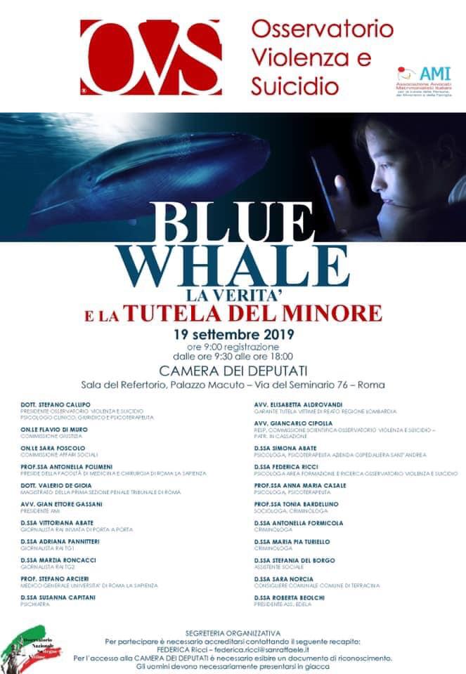 Blue Whale, un fenomeno sociale preoccupante? Se ne parlerà giovedì 19 settembre in occasione del convegno “Blue Whale, la verità e la tutela del minore”, organizzato dal dottor Stefano Callipo, Presidente dell’Osservatorio Violenza e Suicidio, dalle ore 9,30 alle ore 19, presso la sala del Refettorio, Palazzo Macuto, Camera dei Deputati. Un’iniziativa che si preannuncia attuale e molto interessante. Il convegno si propone di fare chiarezza in merito alla notizia diffusa da diverse trasmissioni televisive, secondo cui alcuni suicidi avvenuti in Italia sarebbero legati al fenomeno del Blu Whale: fenomeno che miete ogni anno circa 4mila vittime.