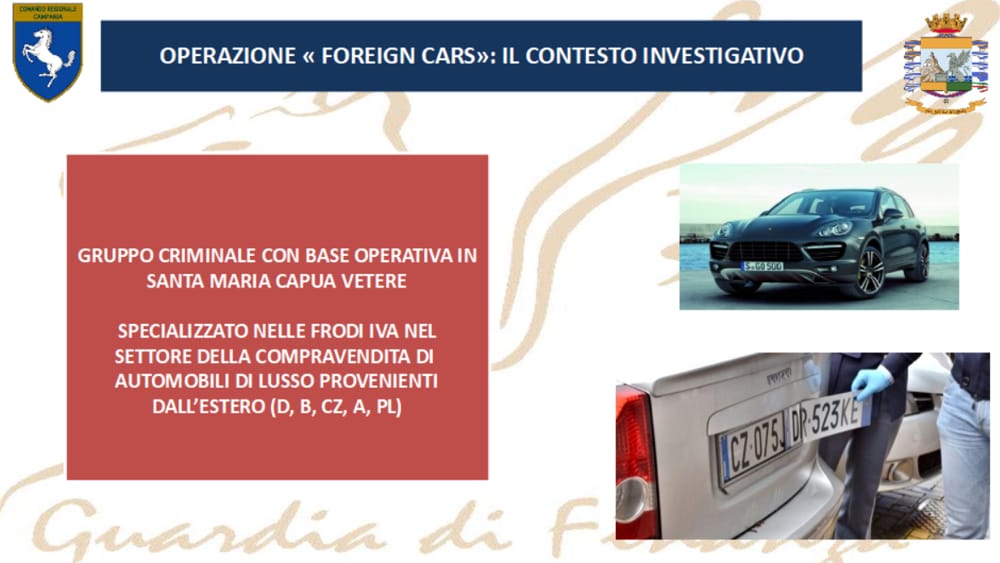 L’attività di indagine, denominata ‘Foreign Cars’ ha permesso di individuare e neutralizzare un gruppo criminale, operante a Santa Maria Capua Vetere, che ha commercializzato, solo dal 2014 al 2017, centinaia di veicoli di provenienza comunitaria in totale evasione d’imposta, immatricolate in Italia grazie a fatture false. L’organizzatore della frode, secondo il gip, è Raffaele Perrino, 56enne. Che ha utilizzato 8 società italiane e 3 con sede in Repubblica Ceca, tutte intestate a prestanomi compiacenti ed evasori fiscali.