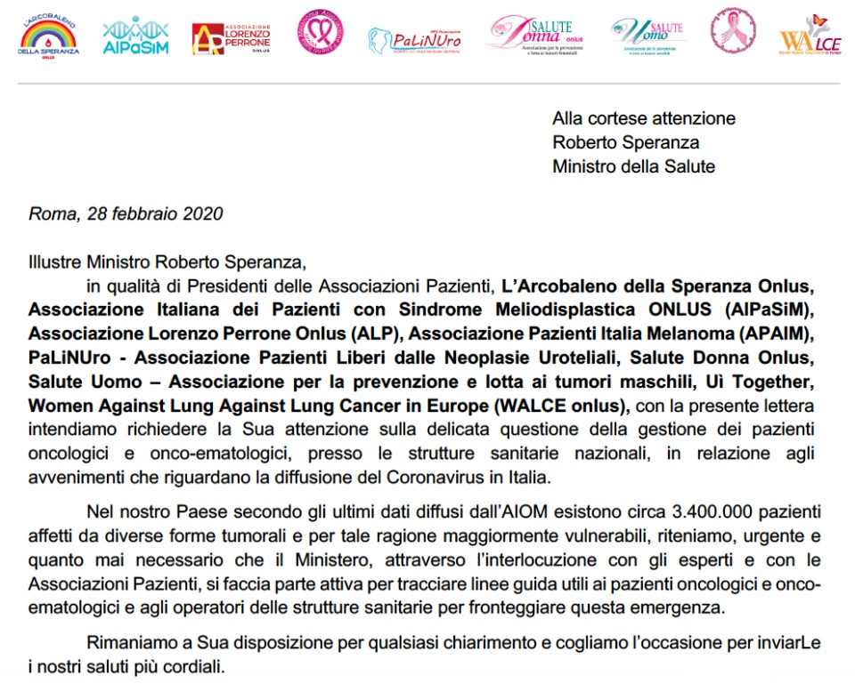 Alla luce di questo, le associazioni di pazienti L’Arcobaleno della Speranza Onlus, Associazione Italiana dei Pazienti con Sindrome Meliodisplastica ONLUS (AIPaSiM), Associazione Lorenzo Perrone Onlus (ALP), Associazione Pazienti Italia Melanoma (APAIM), PaLiNUro – Associazione Pazienti Liberi dalle Neoplasie Uroteliali, Salute Donna Onlus, Salute Uomo – Associazione per la prevenzione e lotta ai tumori maschili, Uì Together, Women Against Lung Against Lung Cancer in Europe (WALCE onlus) hanno scritto una lettera aperta al Ministro della Salute Roberto Speranza per richiedere la sua attenzione sulla delicata questione della gestione dei pazienti oncologici e onco-ematologici, presso le strutture sanitarie nazionali, in relazione agli avvenimenti che riguardano la diffusione del coronavirus in Italia.