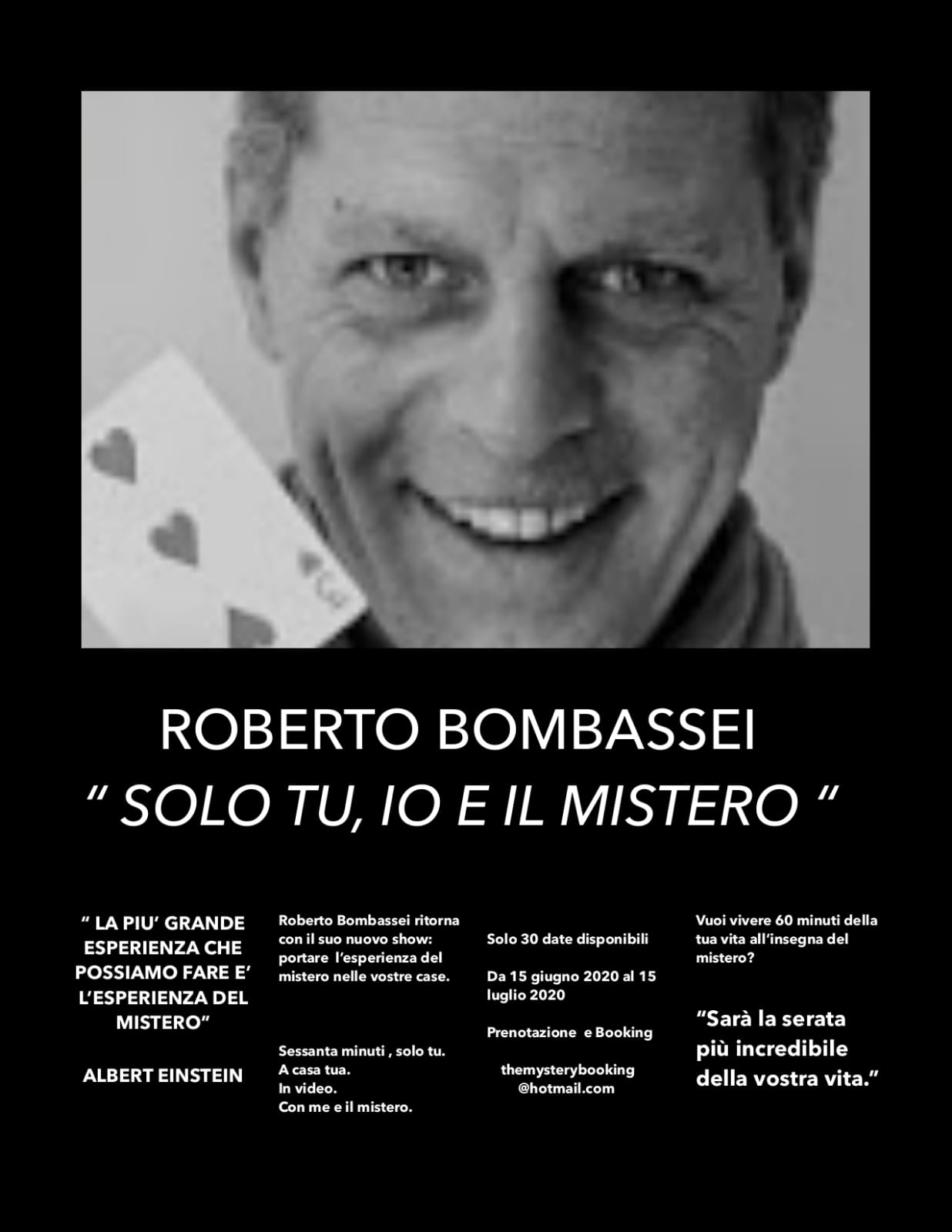 “ In questi mesi di lockdown gli spettacoli dal vivo sono stati tutti annullati e molti colleghi hanno utilizzato le varie piattaforme online per continuare a stupire . Quello che ho creato io non è uno spettacolo per tutti. Sono sessanta minuti di pura magia e mistero , a tu per tu, in video.