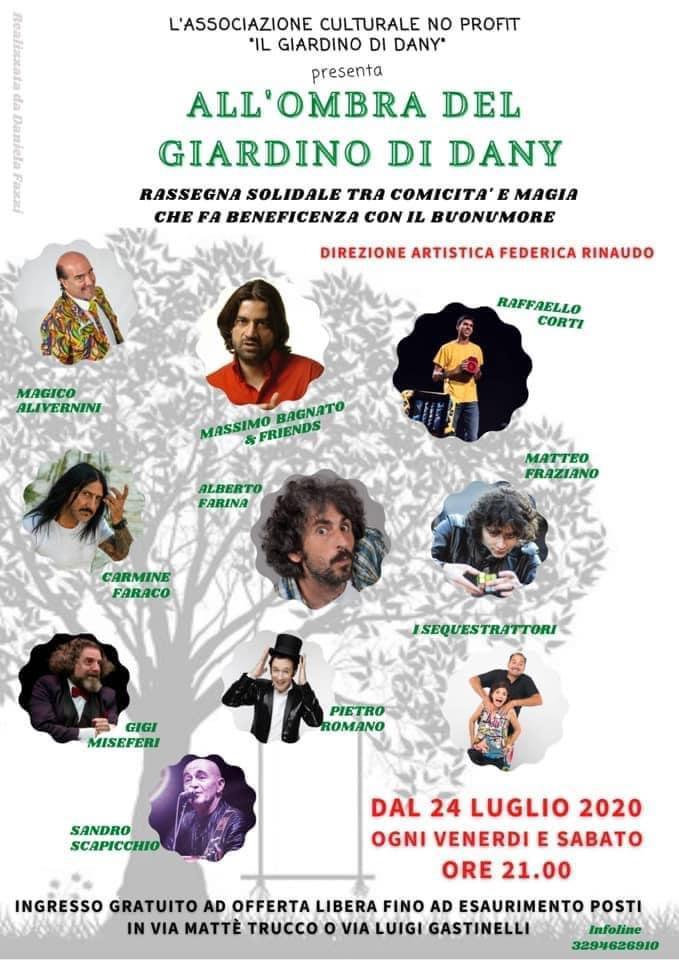 Si tratta di una rassegna solidale tra comicità e magia che fa beneficenza con il buonumore, che si svolgerà a partire dal 24 luglio, ogni venerdì e sabato alle ore 21.00, nel quartiere di Ponte di Nona proprio nel parco che l’Associazione culturale No Profit Il Giardino di Dany, dopo numerose richieste, ha ricevuto in adozione da Roma Capitale. L’area verde, situata tra via Mattè Trucco e via Luigi Gastinelli, curata dai familiari e dagli amici del giovane che hanno sfalciato l’erba, piantato alberi e acquistato alcune panchine grazie ad una gara di solidarietà, è pronta per ospitare sul palco alcuni noti professionisti della risata ma anche illusionisti delle arti magiche (in collaborazione con il Club Magico Italiano Gruppo Lazio) che offriranno brillanti perfomance.