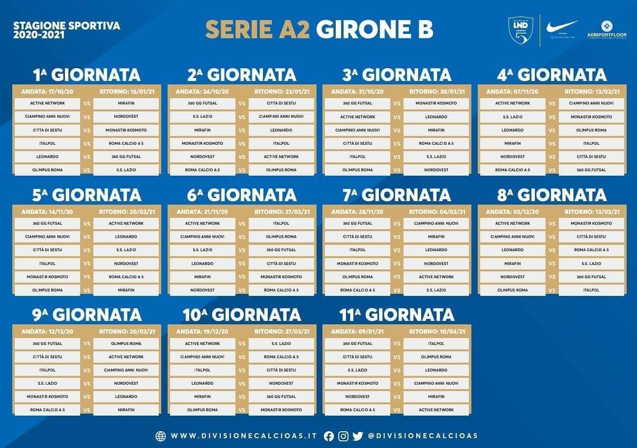 La Serie A2 è stata suddivisa in 3 gironi, con la AS Roma Calcio a 5 collocata nel Girone B: Active Network, Italpol, Ciampino Anni Nuovi, Nordovest, Città di Sestu, Monastir Kosmoto, Leonardo, 360 gg Futsal, Olimpus Roma e SS Lazio.
