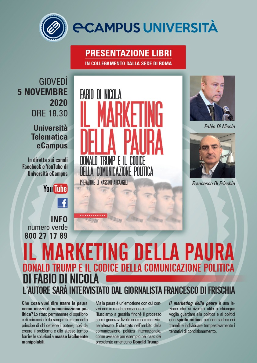 L’Università degli Studi eCampus presenta, all’interno della propria rassegna editoriale, il libro di Fabio Di Nicola IL MARKETING DELLA PAURA- Donald Trump e il codice della comunicazione politica (Castelvecchi, 2020, pag. 85).