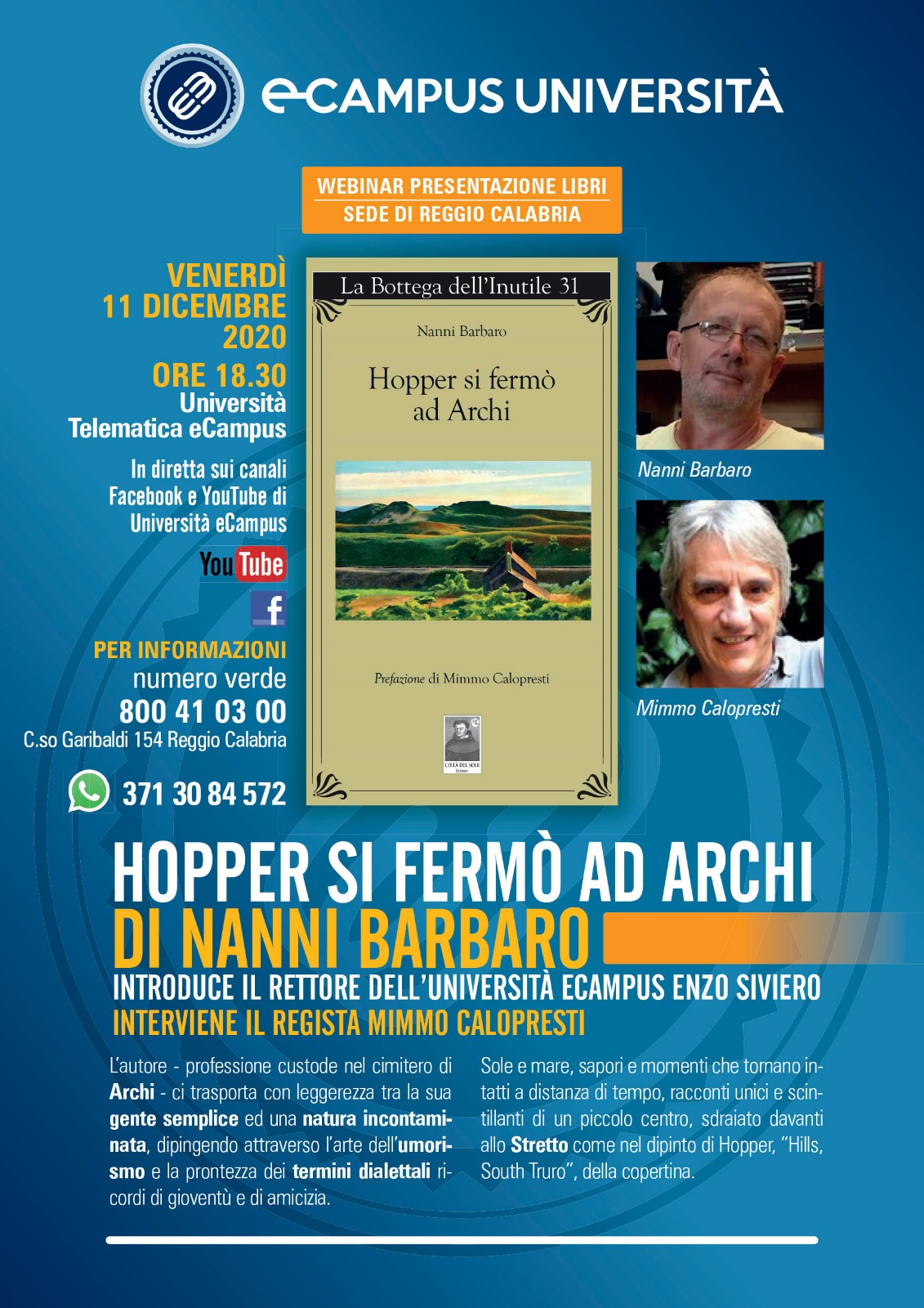 L’Università degli Studi eCampus presenta, all’interno della propria rassegna editoriale online, il libro di Nanni Barbaro HOPPER SI FERMO’ AD ARCHI” – Prefazione di Mimmo Calopresti (Ed. Città del Sole, 2020, pag. 304).