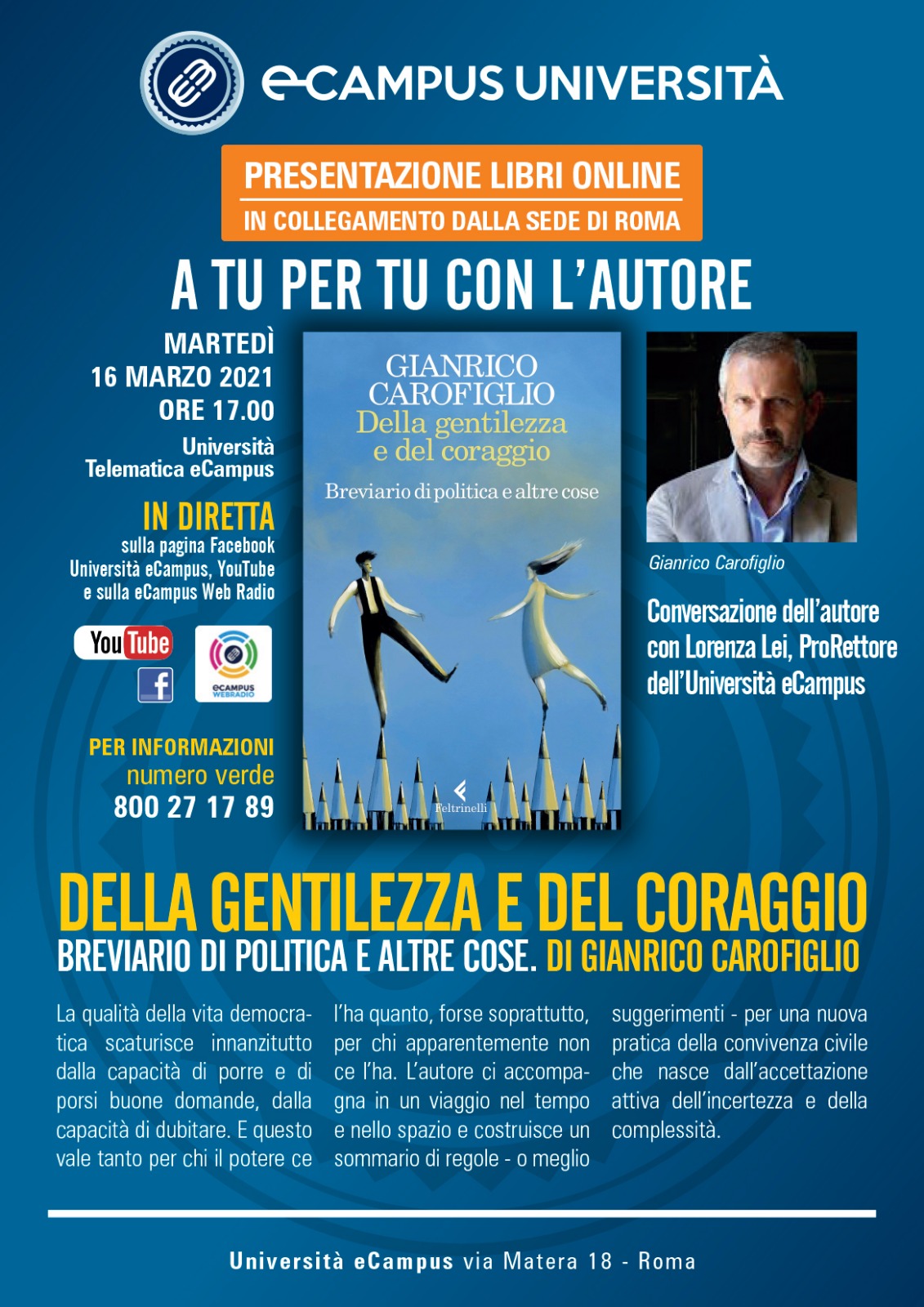 L’Università degli Studi eCampus presenta, all’interno della propria rassegna editoriale online, il libro “DELLA GENTILEZZA E DEL CORAGGIO – Breviario di politica e altre cose”, di Gianrico Carofiglio (Feltrinelli, 2020, pag. 128).