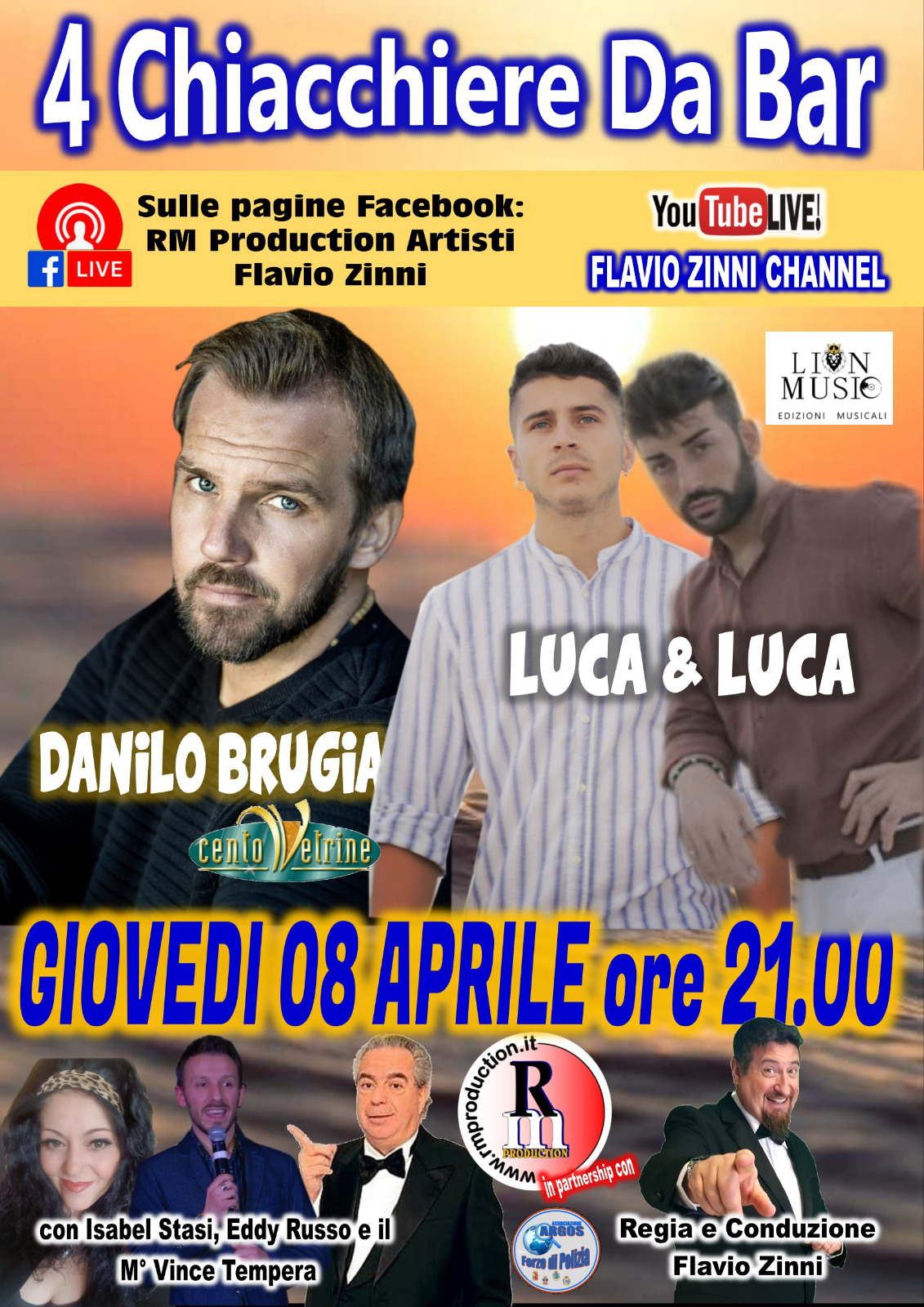 Giovedì 8 Aprile torna il tanto atteso appuntamento con 4 Chiacchere da Bar dove la Director Manager Isabel Stasi di RM PRODUCTION torna a presidiare il programma affiancata come sempre dall’ ormai suo partner di lavoro, il Maestro Vince Tempera dal Regista Flavio Zinni ma anche dal Direttore Tecnico Ballerino Coreografo Eddy Russo. Gli ospiti che entreranno nel Bar virtuale più visto del Web e che siederanno a tavolino con noi questa volta sono Luca Giliberto e Luca Gurrieri due giovani Siciliani che durante il periodo di Lockdown uscirono con grinta ed emozioni sulle note di un celebre brano “SOUND OF SILENCE” un testo che ha colpito il cuore di milioni di ascoltatori sul WEB e non solo..hanno portato Speranza,Forza in un periodo di Incertezze e Sconforti. Adesso tornano in scena con il loro nuovo singolo “TORNI” un brano che questa volta porta tutto sul piano personale con un ritornello che rimane subito in testa ed una canzone più Standard rispetto a prima, che a pochissime ore di uscita sta già facendo numeri pazzeschi su tutte le piattaforme e ottenendo già i primi posti nelle classifiche radio più ascoltate.Ad affiancarli oltre al Manangement di Isabel Stasi ci sarà la “LION MUSIC”etichetta Discografica che ci racconterà tutto quello che si deve sapere su LUCA E LUCA.Gli ospiti non sono finiti siederà nel Bar Virtuale un grandissimo Personaggio un Attore che ha fatto sognare migliaia di noi “DANILO BRUGIA” Amatissimo nella Fiction più vista e seguita da milioni di telespettatori su CANALE 5 “CENTOVETRINE.”oltre ad essere un bravissimo Attore scopriamo che ha una passione anche per il canto.Quindi come sempre sarà una puntata STREPITOSA non mancate….. vi aspettiamo per passare un’ora in compagnia.
