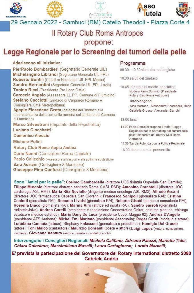 Tutti insieme per sconfiggere i tumori della pelle. Lo urla da qualche tempo Paolo Dominici, presidente del Club Rotary International che per il prossimo 29 gennaio presso il Castello Theodoli a Sambuci (RM) insieme a tutti i soci del suo club, ha organizzata una iniziativa che proporrà visite preventive a tutta la comunità e un testo di legge che verrà discusso con diversi consiglieri regionali che hanno risposto all’appello del Club. Dominici, che nel frattempo denuncia come i periodo di Covid sia paurosamente cresciuta l’incidenza di queste patologie, chiederà alla politica regionale di unirsi, al di là di ogni schieramento, nel percorso di approvazione della auspicabile legge regionale.