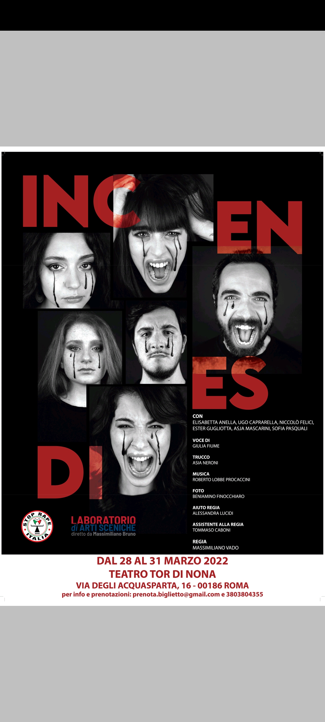 La brutalità si estende così tanto da perderne il controllo, dal non saperne registrare i limiti, la coercizione diventa furia distruttrice e sopruso oltre ogni intensità morale. Per questo motivo lo spettacolo ha il sostegno dell’associazione STOP RAPE ITALIA che porta avanti la “campagna contro lo sfioro e la violenza sessuale nei conflitti” si. dal 1997: un intervento necessario per capire, nuovamente, il tempo che stiamo vivendo”. ⁃ Massimiliano Vado, regista e adattatore Lo spettacolo “Incendies” è prodotto dal Laboratorio di Arti sceniche, che si trova in Via Gregorio VII n° 126, diretto da Massimiliano Bruno e amministrato da Susan El Sawi, una scuola di recitazione, regia e sceneggiatura, che oltre a proporsi come Accademia di teatro e cinema, incoraggia e finanzia i progetti dei propri allievi ed ex allievi: una novità assoluta e preziosa nel panorama nazionale.
