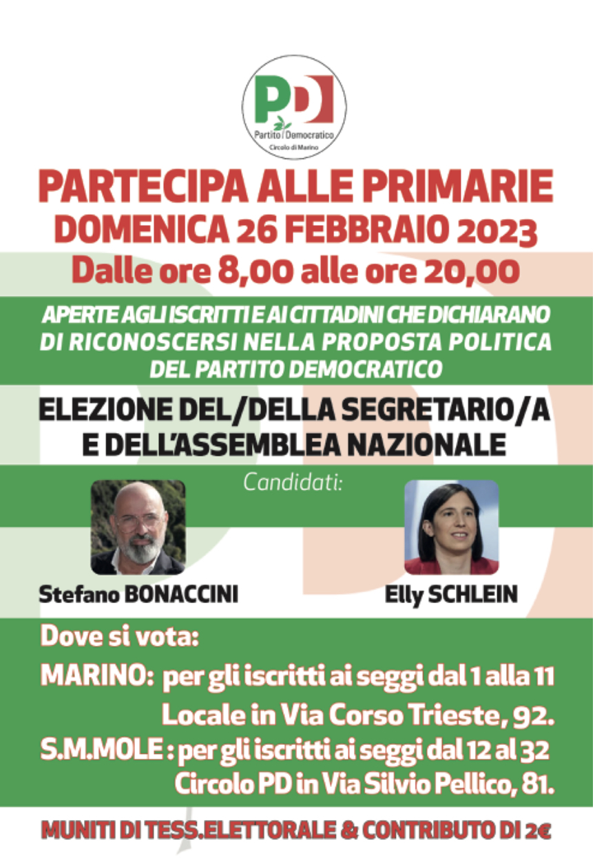 “E’arrivato il momento di reagire e costruire il nostro futuro scegliendo insieme il/la Segretario/a nazionale e la nuova Assemblea nazionale con le Elezioni primarie del Partito Democratico. L’Italia oggi ha bisogno di una nuova forza Democratica e Progressista, larga e inclusiva, concreta nel fare l’opposizione e coraggiosa nel costruire un’alternativa dentro il Parlamento e nel Paese. Ci attende un lavoro difficile e rilevante, per questo sarà fondamentale la partecipazione di tanti cittadini del nostro Paese”. Così, in un comunicato stampa, il segretario cittadino del Pd Marino, Sergio Ambrogiani.