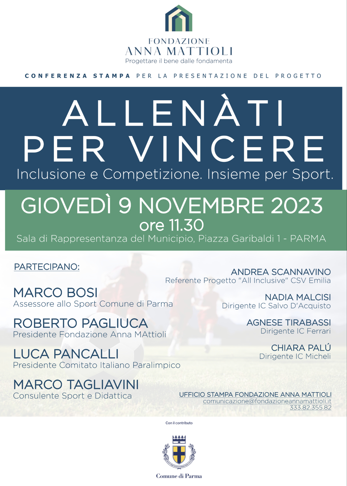 Saranno presenti Marco Bosi, Assessore allo Sport del Comune di Parma, Roberto Pagliuca, Presidente della Fondazione Anna Mattioli, Luca Pancalli, Presidente del Comitato Italiano Paralimpico, Marco Tavaglini, consulente sport e didattica, e Andrea Scannavino, responsabile del progetto “All Inclusive”; CSV Emilia. All’evento interverranno anche Nadia Malcisi, Dirigente dell’IC Salvo D’Acquisto, Agnese Tirabassi, Dirigente dell’IC Ferrari, e Chiara Palú, Dirigente dell’IC Micheli. “In questo momento di complessa e delicata congiuntura economica e sociale, la scuola si trova di fronte a sfide nuove e diventa luogo fondamentale per la crescita e l’integrazione delle giovani generazioni. Per questa ragione, la Fondazione Anna Mattioli, da sempre attiva contro il disagio sociale e le fragilità giovanili, ha deciso di mettere in campo questa iniziativa, per dare un sostegno concreto alle famiglie, per fornire occasioni e supporto alla pratica sportiva e proporre nuovi stimoli al percorso formativo dei minori, anche quelli con disabilità fisica, deficit cognitivo o disagio sociale, per favorire la piena comprensione ed accettazione della diversità come forma di ricchezza nelle tante possibili espressioni di vita. All’insegna del motto “allenàti per vincere”, vogliamo che lo Sport diventi uno strumento pedagogico sempre più efficace e un’occasione di reale uguaglianza, e questo attraverso la stretta sinergia con le istituzioni territoriali: Municipio, Scuole e Terzo Settore. La conferenza di giovedì 9 novembre, dunque, sarà una importante occasione per raccontare tutto questo, vi aspettiamo numerosi” – ha commentato il Presidente della Fondazione Anna Mattioli, Roberto Pagliuca. Cittadinanza e stampa sono invitati a partecipare.