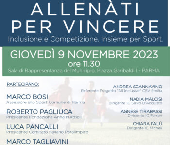 Parma: al via il progetto “Allenàti per vincere”La Fondazione Anna Mattioli contro le fragilità giovanili Tutto pronto a Parma per la presentazione del progetto Allenàti per vincere –Inclusione e Competizione. Insieme per Sport, fortemente voluto dalla Fondazione Anna Mattioli, sostenuto e patrocinato dal Comune. La conferenza stampa si svolgerà il prossimo giovedì 9 novembre, dalle … Leggi tutto Al via il progetto “Allenàti per vincere”