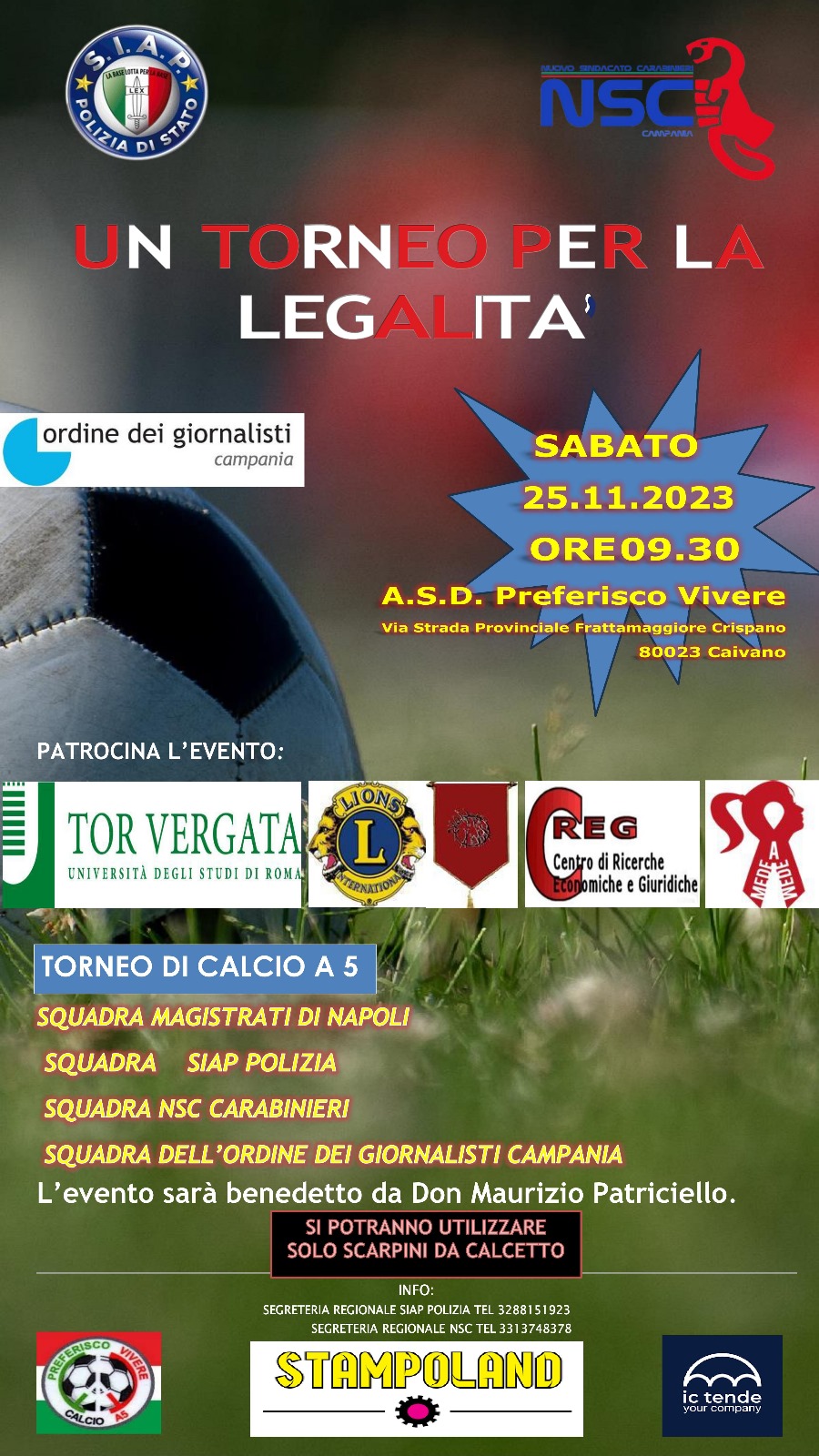 Quattro squadre di calcio: Magistrati, Ordine Giornalisti Campania, Nuovo Sindacato Carabinieri (NSC) e Sindacato Italiano Appartenenti Polizia (SIAP) si incontreranno sabato 25 novembre a Caivano. L’impegno “è diffondere la cultura della sicurezza e della legalità per creare le opportunità dove ogni individuo possa sentirsi libero. Sarà occasione per confermare la presenza dello Stato a Caivano ed avvicinare, tramite lo sport, ai tanti abitanti di quel comune gli operatori che quotidianamente garantiscono sicurezza e legalità”.