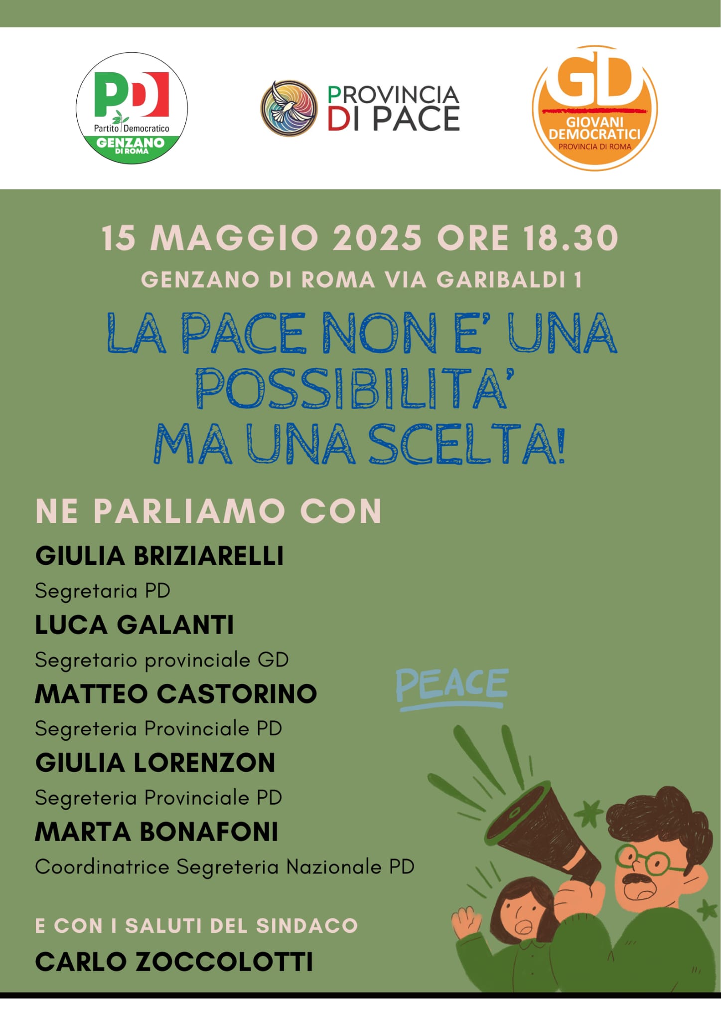 Nella Sezione del PD di Genzano di Roma, si continua a parlare di Pace e a progettare la Pace. Lo scorso 5 marzo 2025 infatti, la Segretaria Giulia Briziarelli e una piccola delegazione sono partiti alla volta di Bruxelles per promuovere la nascita del diritto alla Pace (vedi manifesto e allegati) ed ad oggi l’impegno rimane costante e attivo. Domani, 15 maggio alle ore 18.30 infatti si parlerà di prospettiva alla pace. Anche la Federazione del Partito Democratico sarà presente all’incontro portando avanti il lavoro “Provincia di Pace” che tappa dopo tappa, iniziativa dopo iniziativa ha redatto un documento importante sulla pace e le sue prospettive, con la presenza di Matteo Castorino e Giulia Lorenzon. Presente all’ incontro anche la Coordinatrice della Segreteria Nazionale Marta Bonafoni, per tracciare insieme le prospettive di una pace che non può essere una possibilità ma deve essere una scelta. Al tavolo la significativa presenza dei Giovani Democratici con il Segretario provinciale Luca Galanti.