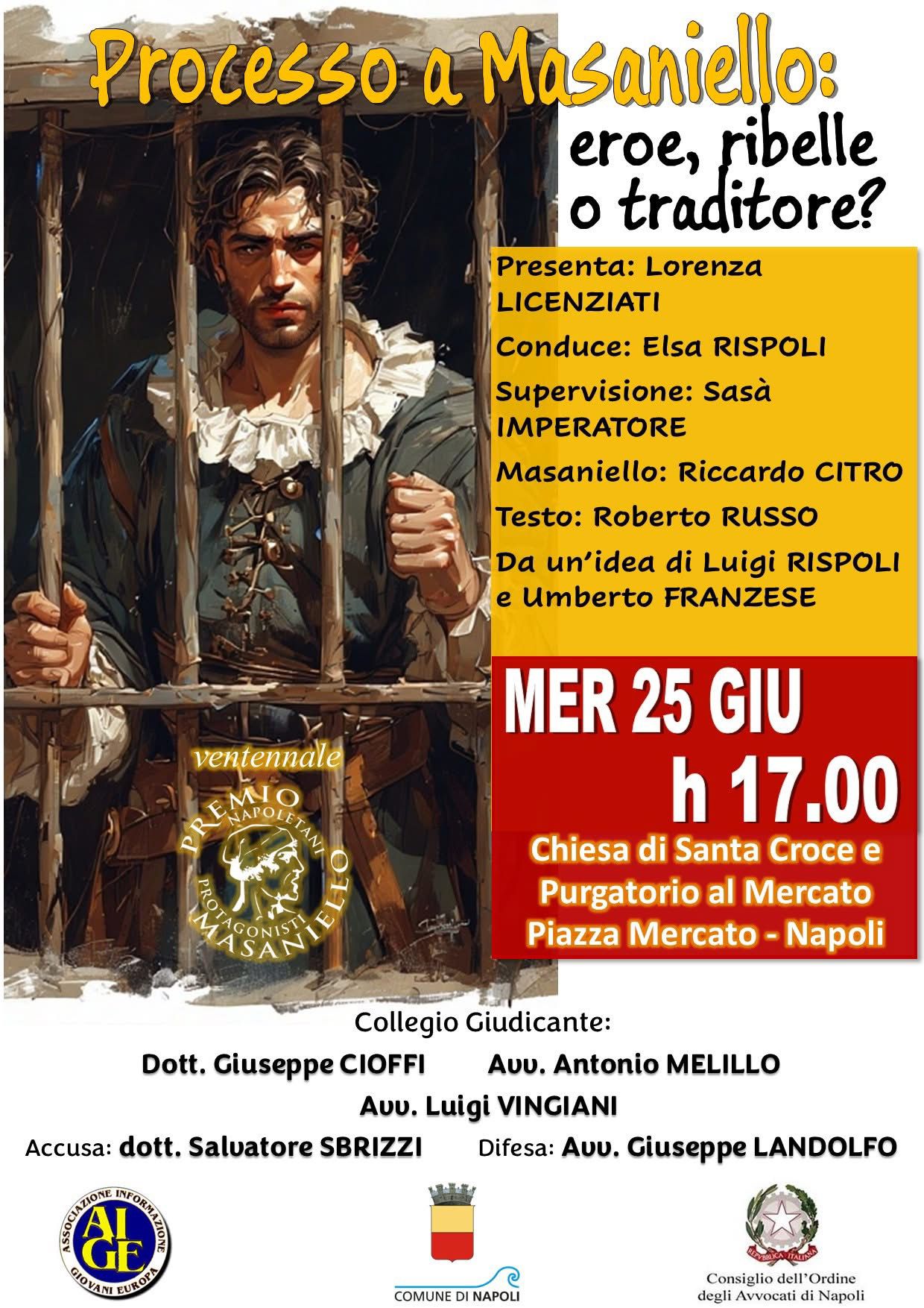 Lunedì 25 giugno alle ore 17.30, nella suggestiva cornice della Chiesa di Santa Croce e Purgatorio al Mercato, in Piazza Mercato a Napoli, l’AIGE – Associazione Informazione Giovani Europa – presenta l’iniziativa “Processo a Masaniello: eroe, ribelle o traditore?”, da un’idea di Luigi Rispoli e Umberto Franzese.