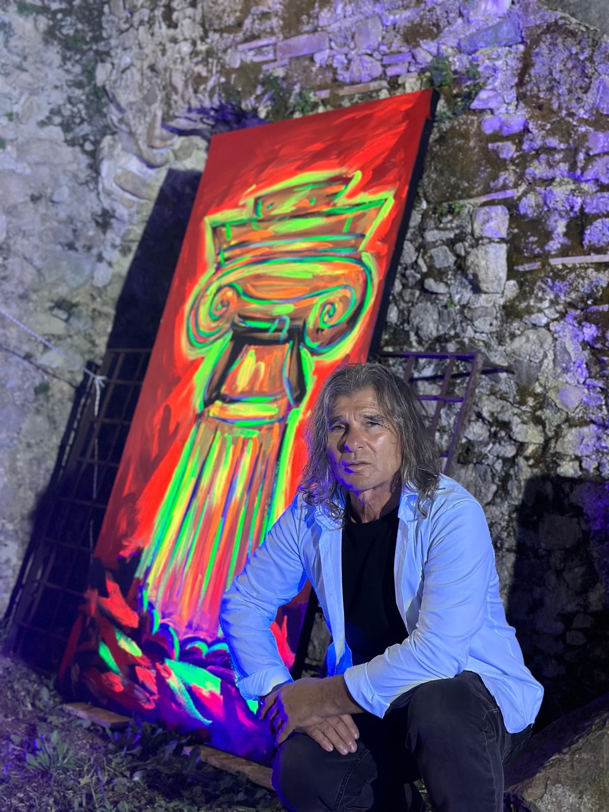 Il percorso espositivo ospita opere iconiche e nuove produzioni, molte delle quali realizzate appositamente per questa mostra. Tra queste spicca Il riposo di Van Gogh sotto il tempio di Nettuno di Paestum, una grande tela dove il maestro olandese, figura emblematica della pittura moderna, è ritratto in un’immaginaria contemplazione delle rovine doriche di Paestum. È proprio questo dialogo visionario tra presente e passato il filo conduttore della mostra. Opere come Poseidone, Hera e Hera Vera restituiscono la potenza archetipica delle divinità greche, mentre Amsterdam e archetipi di Paestum gioca con contrasti geografici e culturali, unendo la geometria urbana del Nord alle linee sacre del Sud. Il paesaggio cilentano è presente in ogni tela, non solo nei soggetti, ma anche nelle atmosfere: dai templi di Paestum alle colonne corinzie, dai simboli animali come il Gallo Lucano e il Leone Lucano, fino alla figura pensante di Parmenide, ogni opera è attraversata da un sentimento profondo per la terra d’origine. A suggellare l’inaugurazione, un momento speciale ha commosso i presenti: la lettura di una poesia inedita del poeta Damiano Guazzo, scritta per l’occasione e dedicata al Maestro Mangone e al suo legame con il Cilento. I versi, intensi e vibranti, hanno saputo cogliere l’anima dell’opera di Mangone e restituirla in parole cariche di emozione, celebrando l’arte come forma di appartenenza e memoria collettiva.