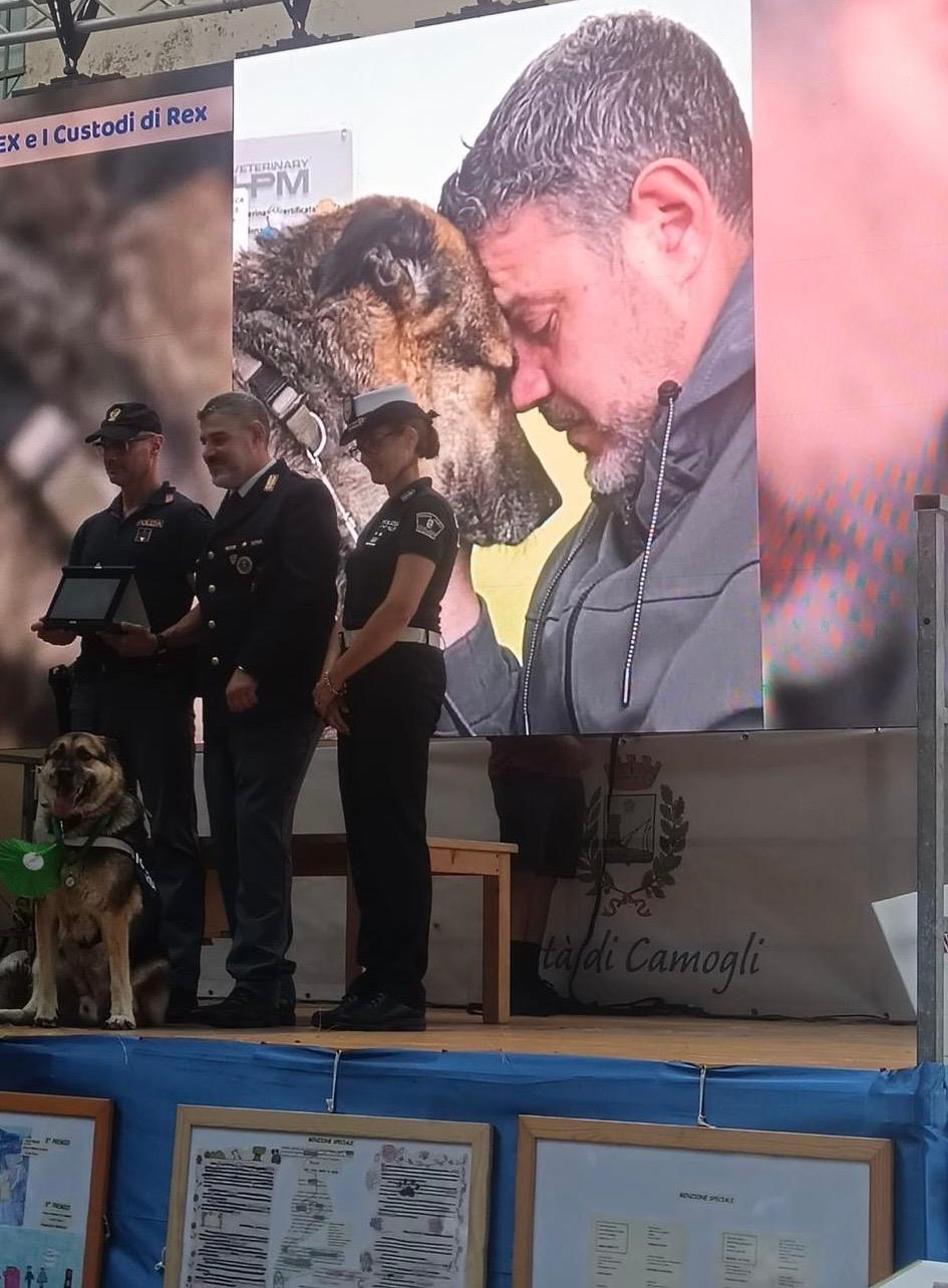 Sabato scorso, in missione fuori porta, Rex, agghindato con la pettorina della Polizia, conquistata di recente grazie allo status guadagnatosi nel tempo di “poliziotto a quattro zampe”, con la sua dolcezza ed il suo sguardo fiero ha ritirato il premio, accompagnato dalla sua famiglia adottiva della Polizia di Stato.