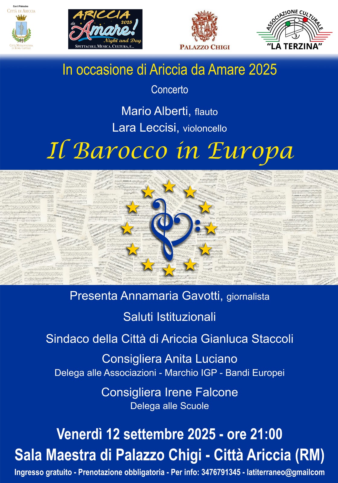 Si terrà venerdì 12 settembre 2025 alle ore 21,00 il Concerto “Barocco in Europa” promosso dall’Associazione culturale La Terzina con il patrocinio del Comune di Ariccia, in occasione di Ariccia da Amare 2025.