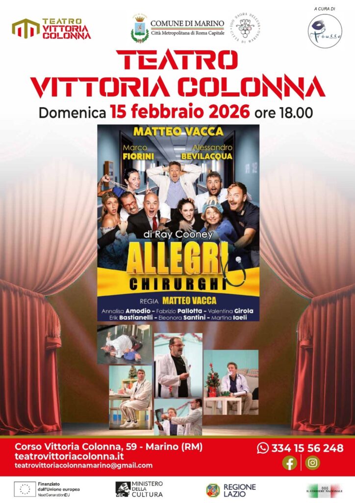Il secondo “Allegri chirurghi” di Ray Cooney andrà in scena domenica 15 febbraio 2026 alle ore 18,00 con la regia di Matteo Vacca. Sul palco gli attori Matteo Vacca, Marco Fiorini, Alessandro Bevilacqua, Annalisa Amodio, Fabrizio Pallotta, Valentina Girola, Erik Bastianelli, Eleonora Santini e Martina Iaeli.