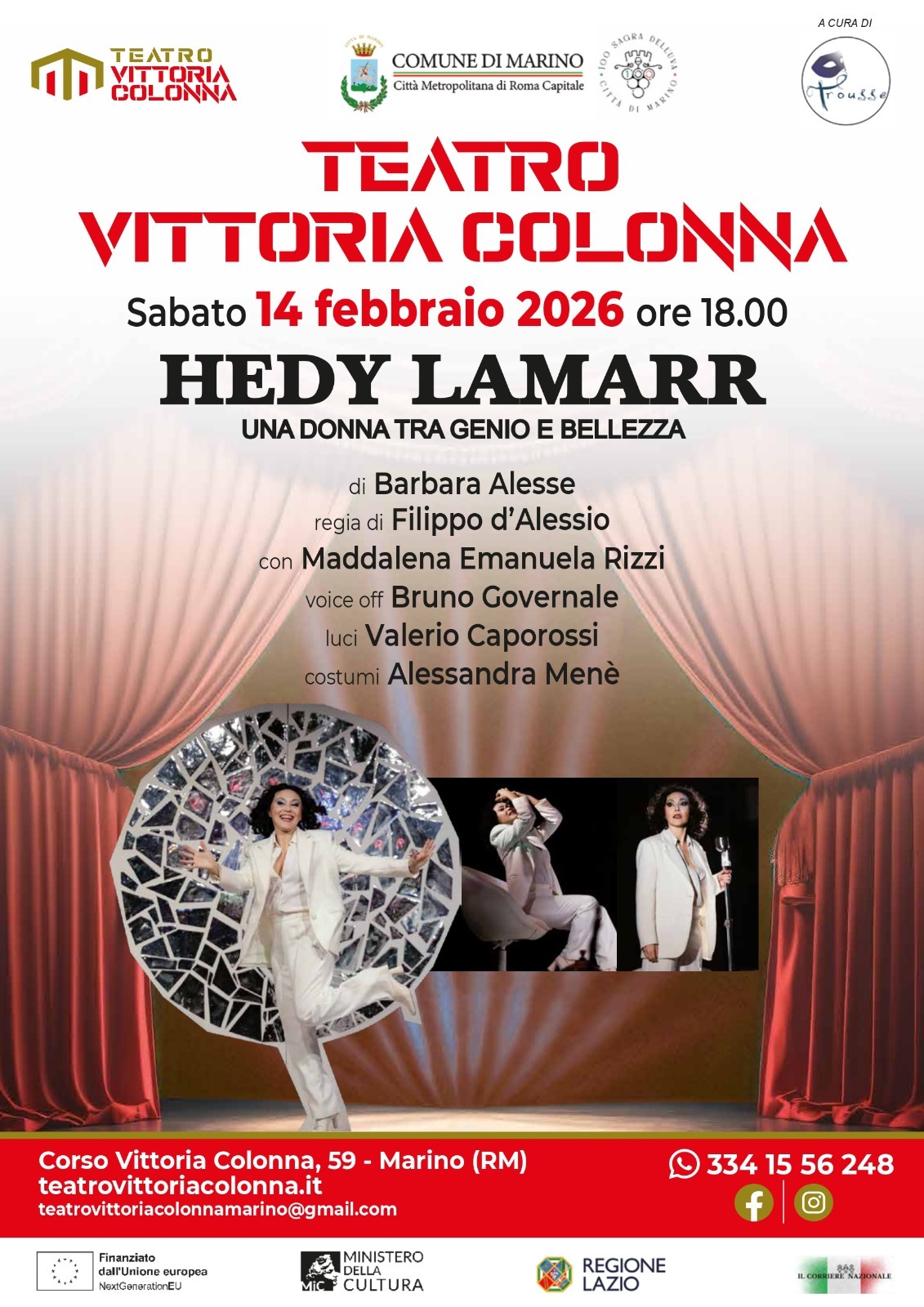 Il primo “Hedy Lamarr”  – una donna tra genio e bellezza – di Barbara Alesse si terrà Sabato 14 febbraio 2026 alle ore 18,00 con la regia di Filippo D’Alessio. Protagonista assoluta Maddalena Rizzi. Voice off Bruno Governale, Luci di Valerio Caporossi, Costumi di Alessandra Menè.