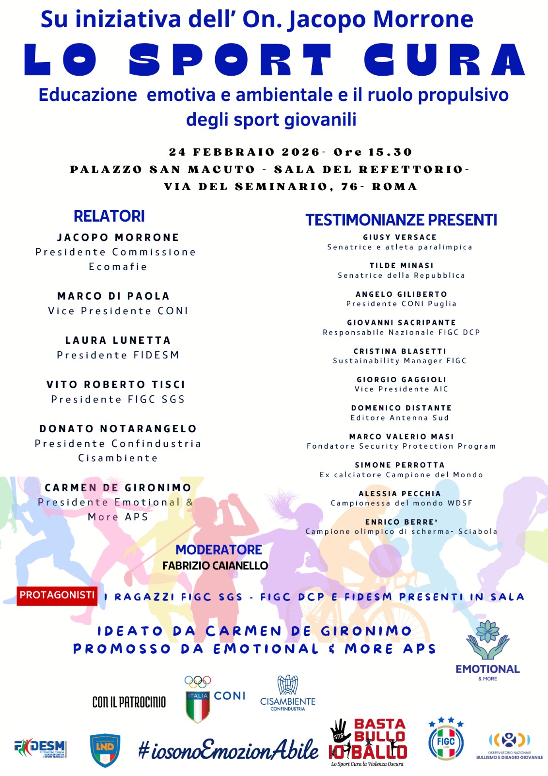 Accanto agli interventi istituzionali, tra gli altri, il convegno ospiterà testimonianze autorevoli del mondo sportivo e istituzionale, tra cui i campioni del mondo Simone Perrotta, Alessia Pecchia ed Enrico Berrè, e le Senatrici Giusy Versace e Tilde Minasi.
